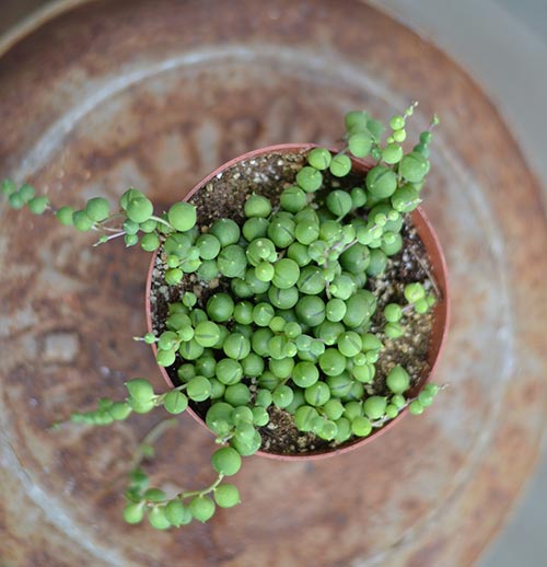 Ένα πολύ ιδιαίτερο φυτό που σε όποιος χώρο και να τοποθετηθεί σίγουρα θα τραβήξει την προσοχή! Πρόκειται για παχύφυτο που τα σφαιρικά φύλλα του μοιάζουν περισσότερο με ζουμερούς καρπούς. Στη φύση το φυτό αυτό αναπτύσσεται σαν εδαφοκαλυπτικό. Στους εσωτερικούς χώρους φυτεύεται σε κρεμαστά καλάθια, ωστόσο δημιουργεί εντυπωσιακές εικόνες και αν φυτευτεί σε ρηχά πιάτα. Όπως όλα τα παχύφυτα χρειάζεται φωτιές θέσεις, καλή αποστράγγιση και λίγο πότισμα. Το σωστότερο είναι να φυτεύεται ε υπόστρωμα κατάλληλο για κάκτους.