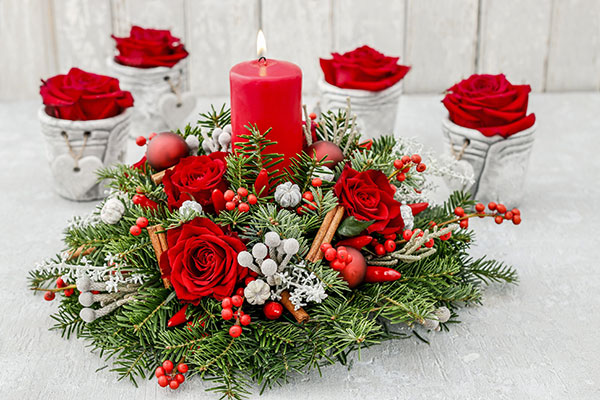 Το κόκκινο δεν μπορεί να λείπει από τις χριστουγεννιάτικες επιλογές. Κλασική εορταστική σύνθεση με κόκκινο κερί και τριαντάφυλλα. Ιδανική πρόταση για την κεντρική διακόσμηση του χριστουγεννιάτικου τραπεζιού. Μπορεί να χρησιμοποιηθεί και για το στολισμό γαμήλιου τραπεζιού την περίοδο των Χριστουγέννων.