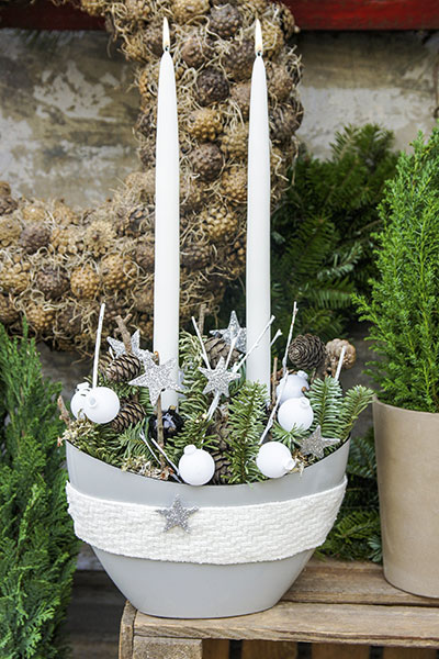 Κομψή και διαχρονική σύνθεση με λευκά κεριά. Ένα γκρι κασπώ με ιδιαίτερο σχήμα στολίζεται με κουκουνάρια, έλατο, φυσικά και ασημένια κλαδάκια, μικρές λευκές μπάλες και λαμπερά αστεράκια. Τα δύο λευκά κεριά στο κέντρο δίνουν ύψος σε όλη την εορταστική σύνθεση.