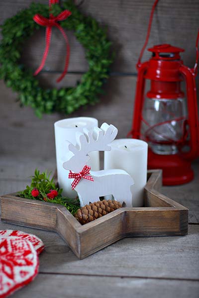 Ένας ξύλινος δίσκος αστέρι είναι η βάση για αυτή τη minimal χριστουγεννιάτικη σύνθεση. Τα λευκά κεριά γίνονται φόντο για το επίσης λευκό και ξύλινο ταρανδάκι.
