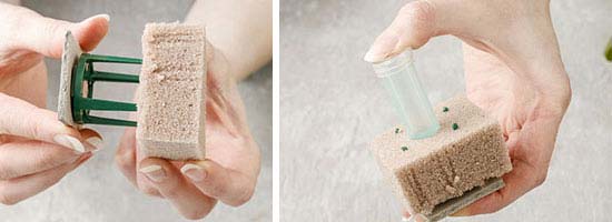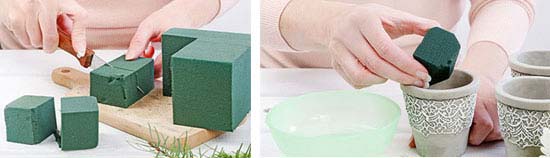 Το σφουγγάρι ανθοδετικής κόβεται στο κατάλληλο μέγεθος, μουσκεύεται καλά και τοποθετείται στα γλαστράκια.