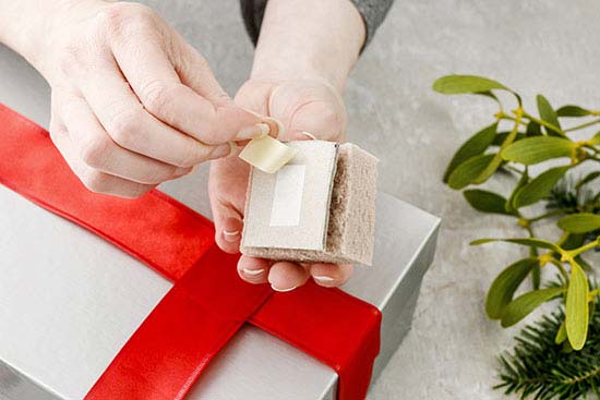 Με την ταινία διπλής όψης το χαρτόνι στεριώνεται στο κουτί που έχει αμπαλαριστεί σαν δώρο.