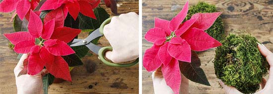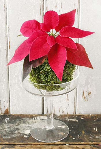 Μικρή και εύκολη κατασκευή αλλά με πολλές εφαρμογή. Η ποϊνσέττια πάνω σε μία «φυσική» μπάλα μπορεί να βρει τη θέση της σε κάθε διακοσμητική γωνιά. Μέσα σε ένα διαφανές κουτί ή ένα γυάλινο κασπώ μπορεί να αποτελέσει εορταστικό δώρο. Πάνω σε μία τουρτιέρα με πόδι διακοσμεί το γιορτινό τραπέζι.