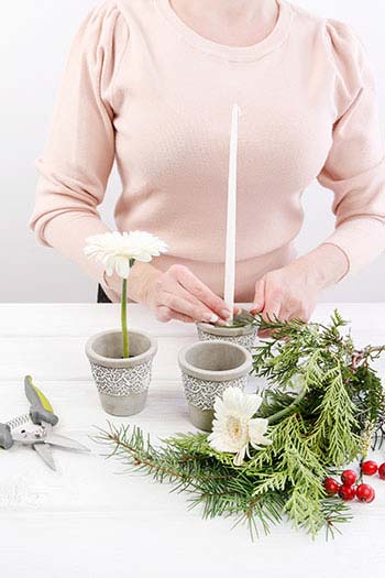Σε κάθε γλαστράκι στο κέντρο τοποθετείται το κερί και από μία ζέρμπερα. Το κερί πρέπει να έχει το μεγαλύτερο ύψος, ακολουθεί η μία ζέρμπερα και στη συνέχεια η άλλη.
