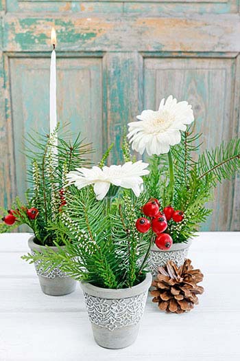 Στις δύο κατασκευές συμμετέχει η ποϊνσέττια που είναι κατεξοχήν το λουλούδι των Χριστουγέννων. Η τρίτη κατασκευή είναι μία ευχάριστη έκπληξη που συνδυάζει τη λευκή ζέρμπερα με τη χριστουγεννιάτικη διακόσμηση.