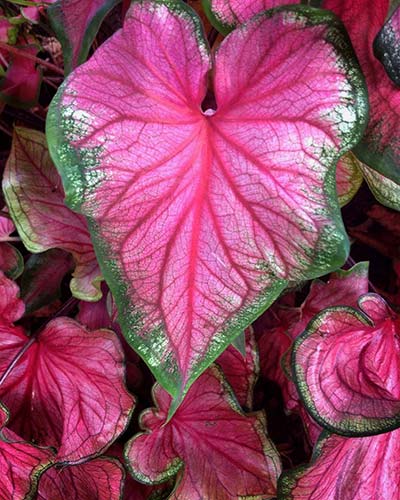 Ακόμη ένα φυτό εσωτερικού χώρου που έχει πολλές ποικιλίες με φύλλα σε διάφορες αποχρώσεις του ροζ είναι το καλάδιο. Είναι ένα ιδιαίτερο φυτό με μεγάλα πλατιά φύλλα και όρθια ανάπτυξη. Έχει ύψος 30-80 cm περίπου και στη χώρα μας αναπτύσσεται κυρίως σαν φυτό εσωτερικού χώρου. Αναπτύσσεται σε υπόστρωμα με καλή αποστράγγιση αλλά απαιτεί συχνό πότισμα ώστε να διατηρεί πάντα λίγη υγρασία. Το καλάδιο ενώ αγαπάει τη ζέστη πρέπει να προστατεύεται από το άμεσο ηλιακό φως. Η πολύωρη έκθεση σε άμεση ηλιακή ακτινοβολία μπορεί να επηρεάσει αρνητικά το χρώμα των φύλλων.